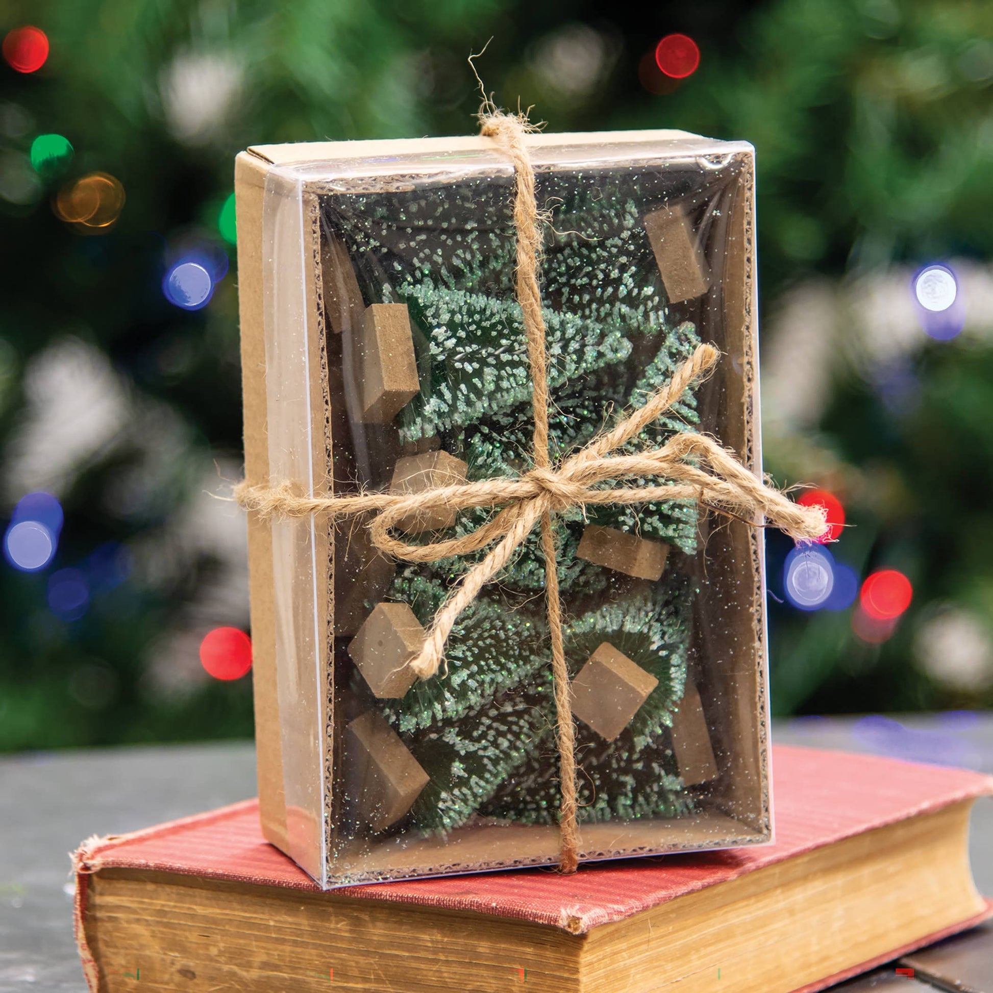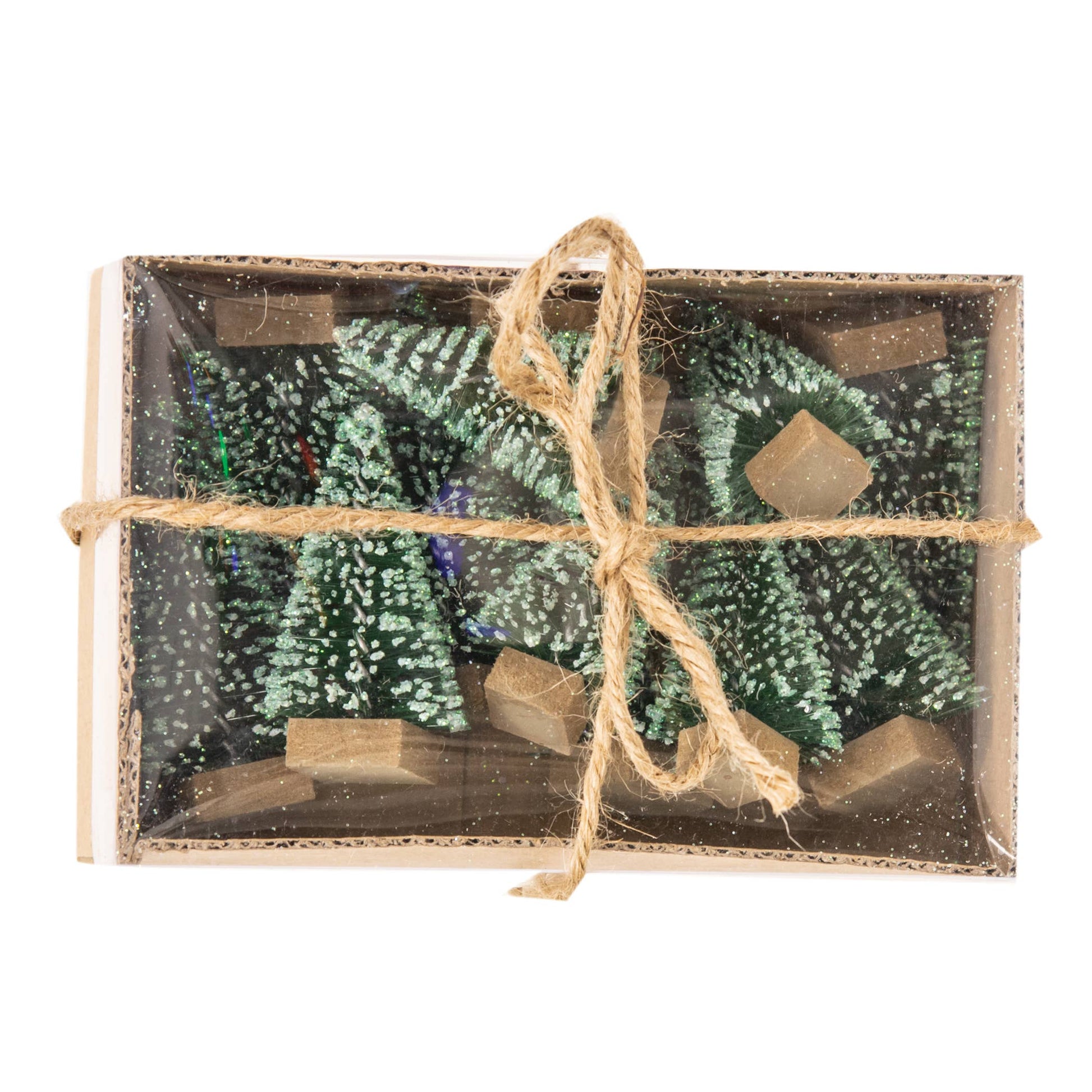 Trees have a wood base and are freestanding for display on tabletops, shelves, or mantels. Measurements vary somewhat; up to approximately 3" x 2".