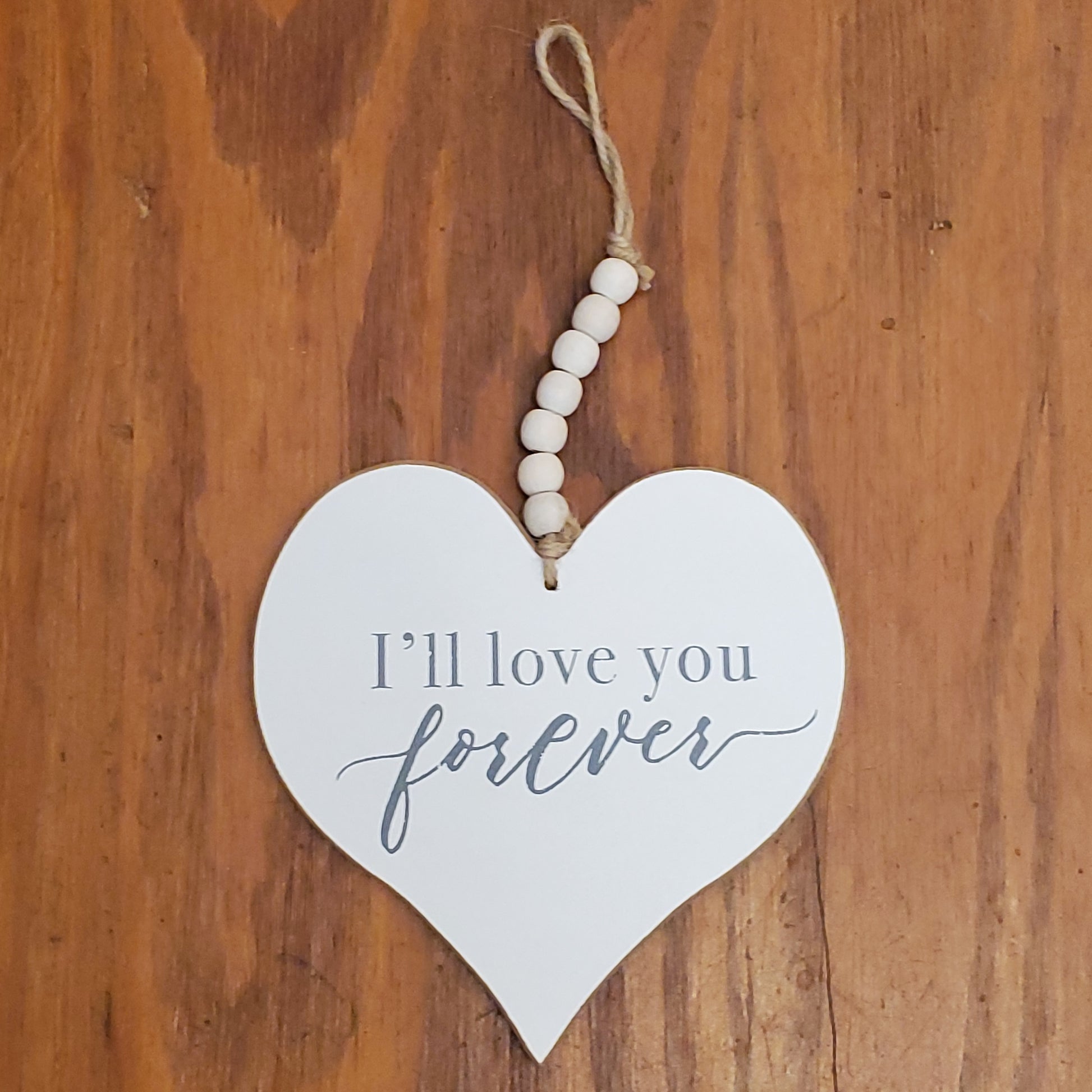 This lovely, rustic beaded decor measures approximately 6" x 6" and bears the touching sentiment "I'll love you forever".