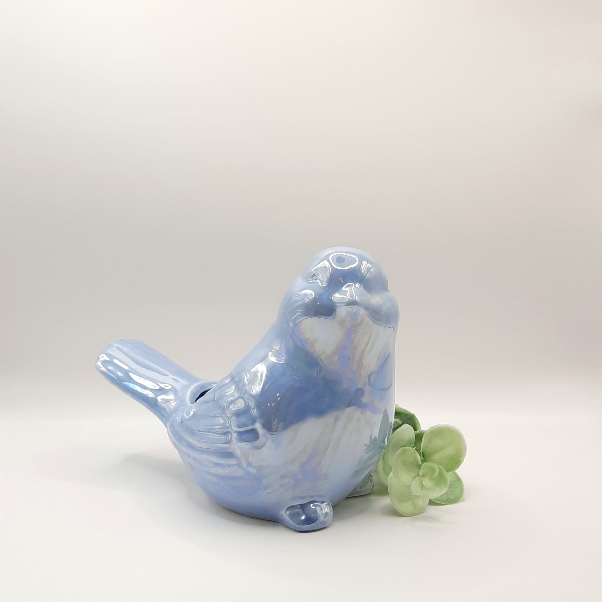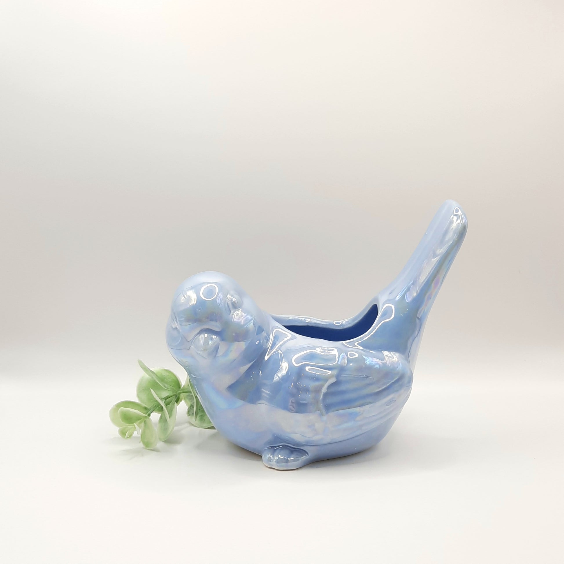 Blue iridescent bird cachepot (available in two poses) measures approximately 6" x 5" x 5".