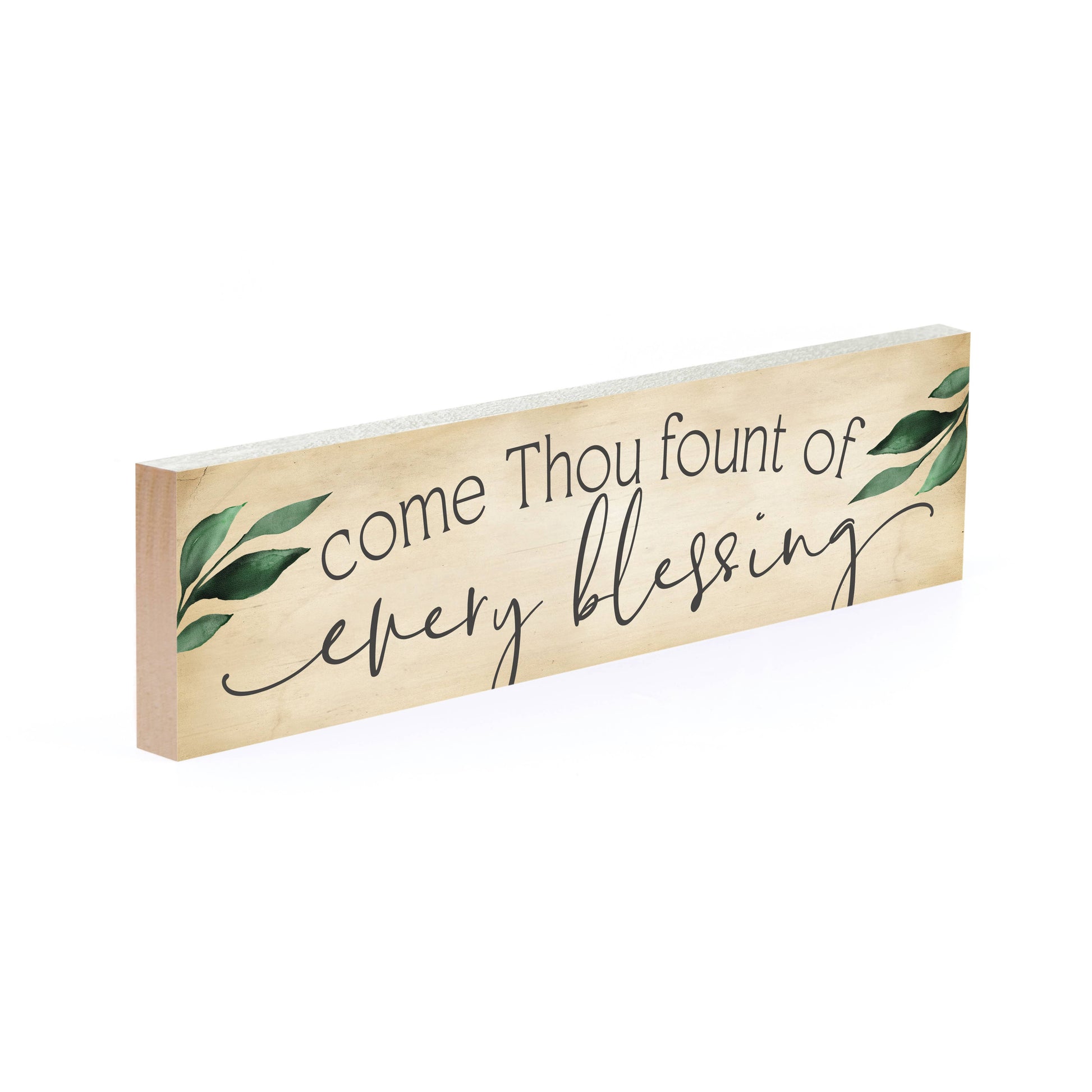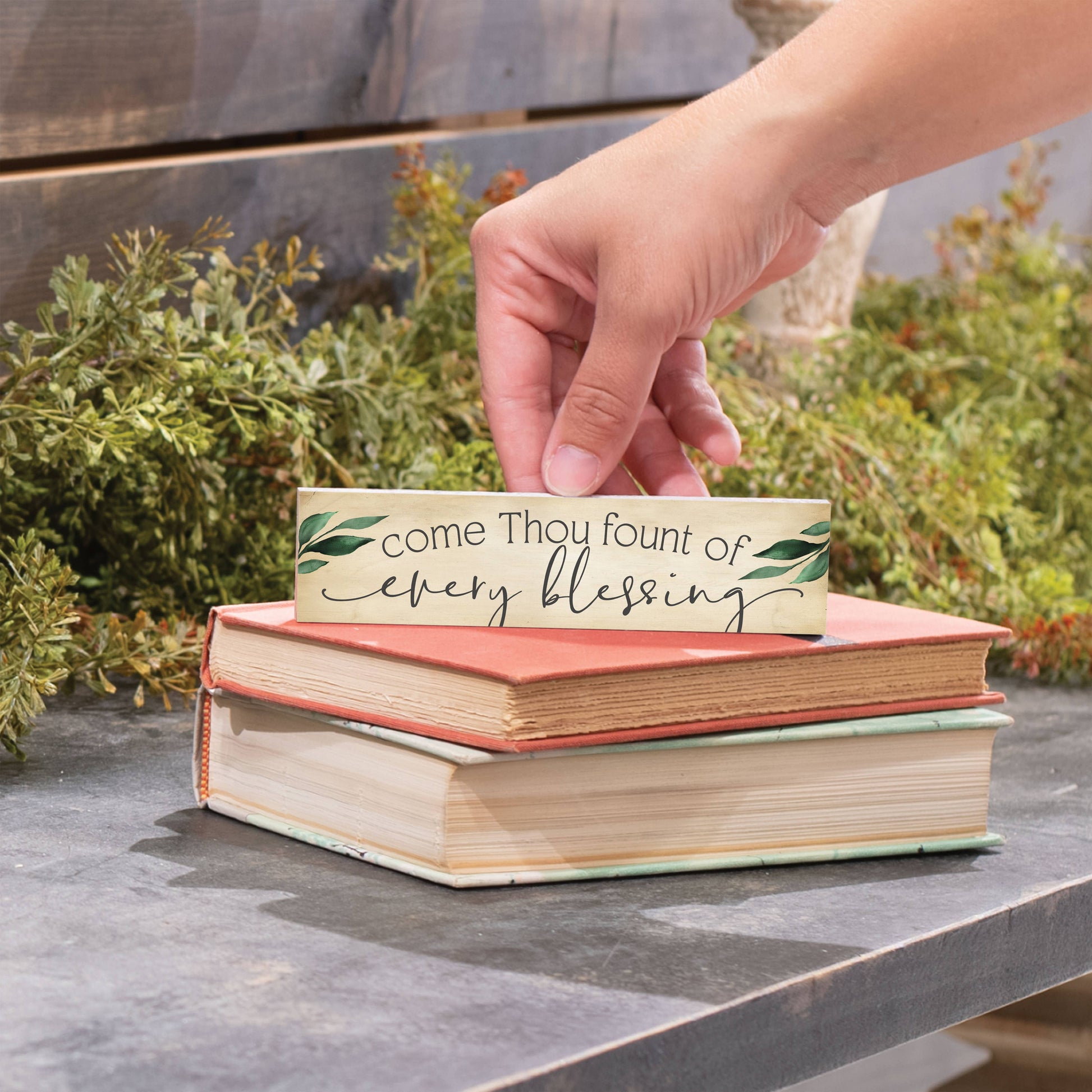 This tiny, lightweight wooden sign bears the attractively illustrated lyric, "Come Thou font of every blessing".