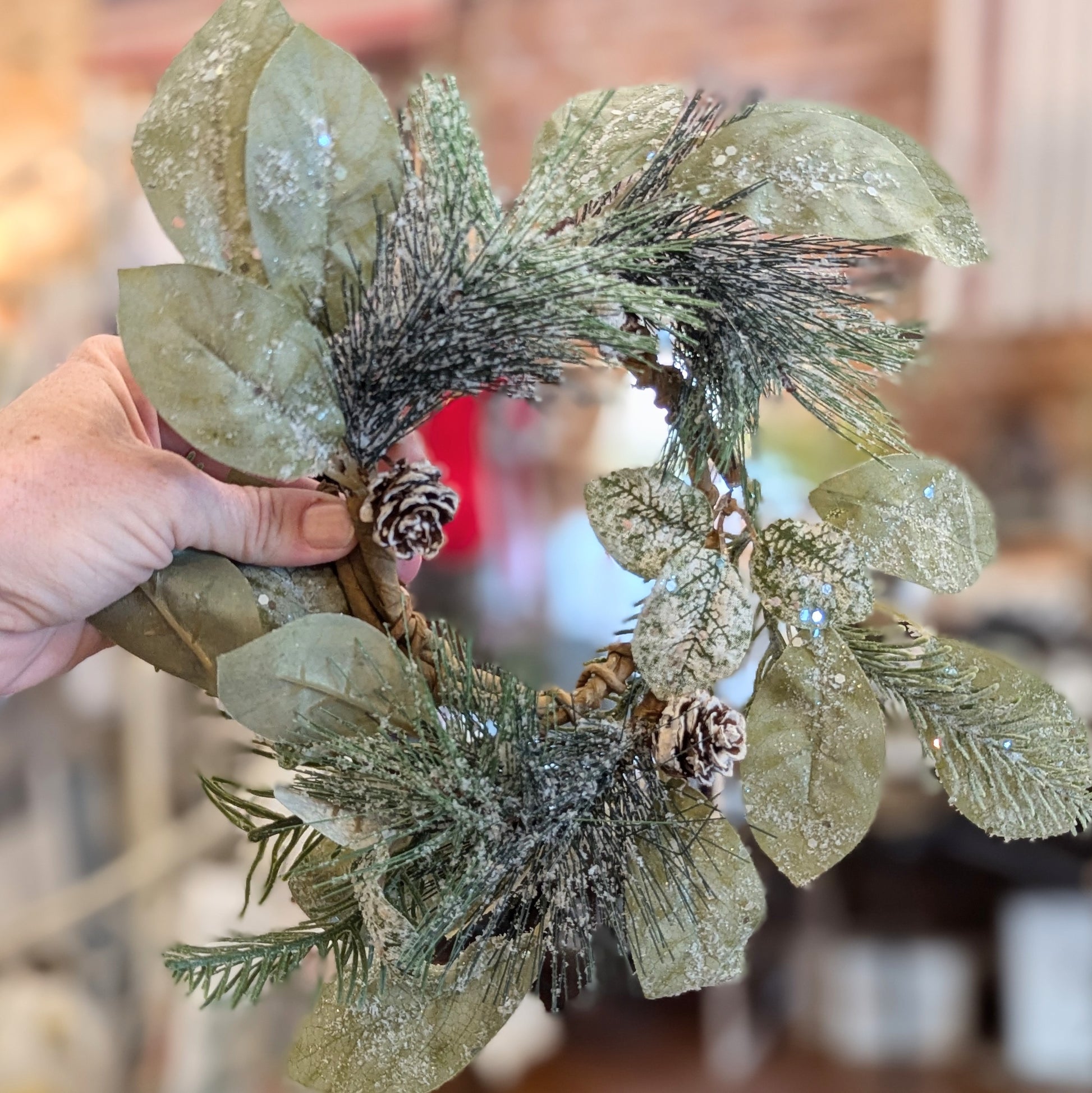 Small wreath/candle ring presents faux leaves, needles, and pinecones (dusted with sparkling snow, of course!) and measures 3.5" inside diameter.
