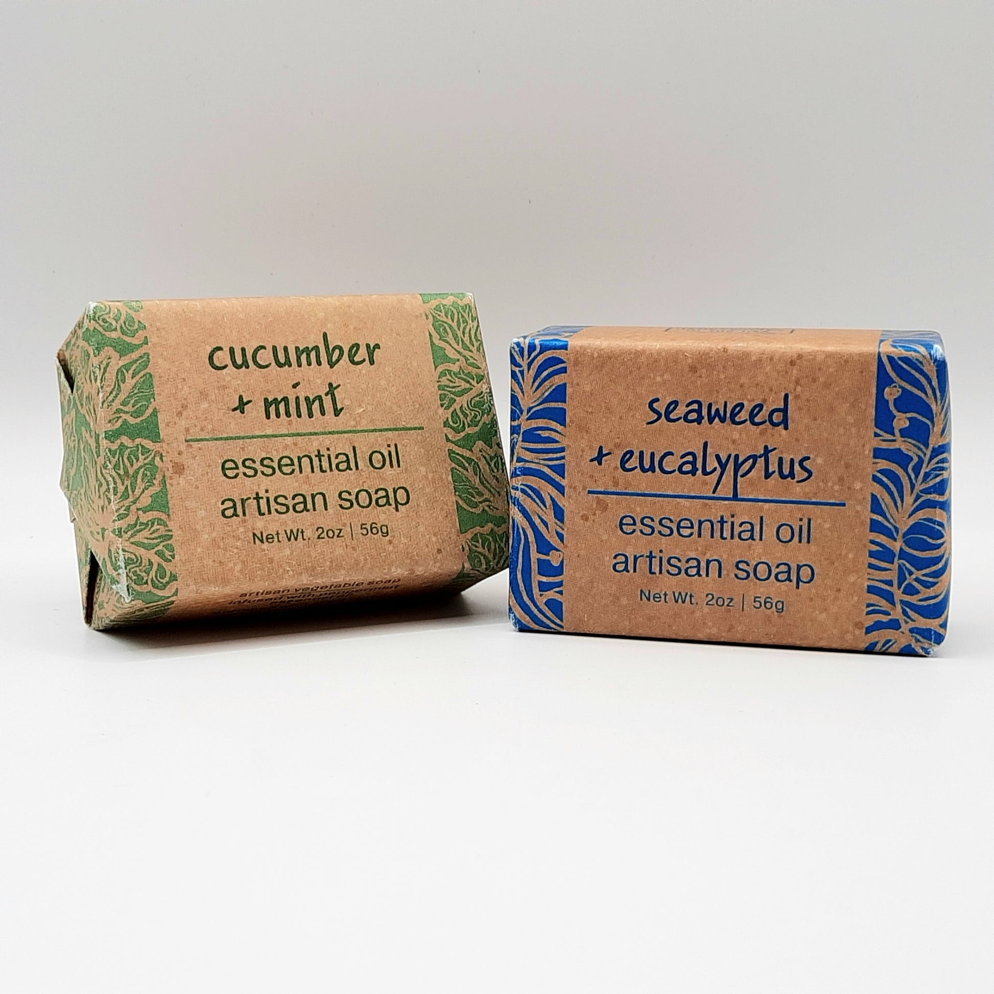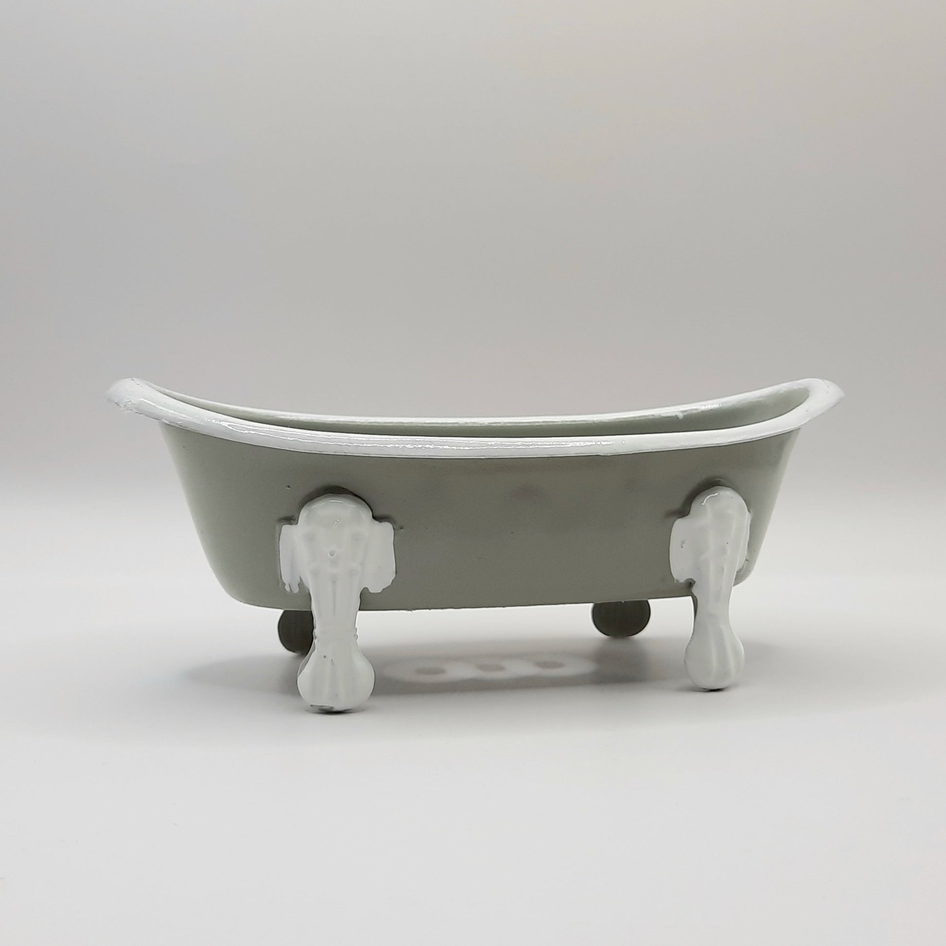 Let's add a couple of little bar soaps, fragranced with essential oils, of course -- and let's tuck them into a sweet little gray bathtub soap dish.