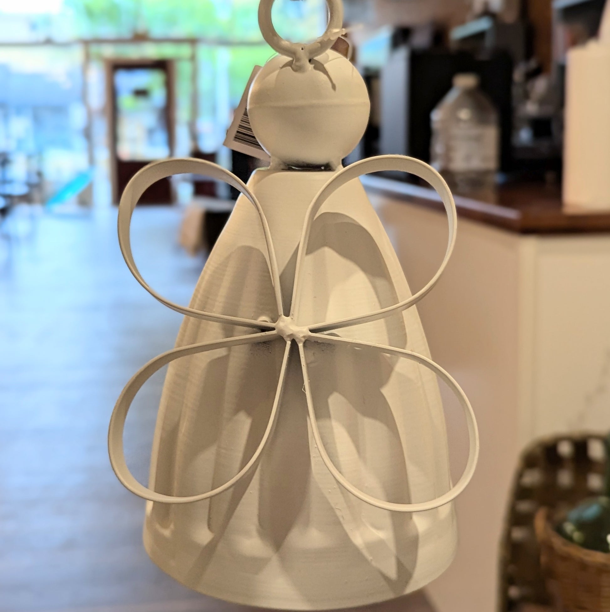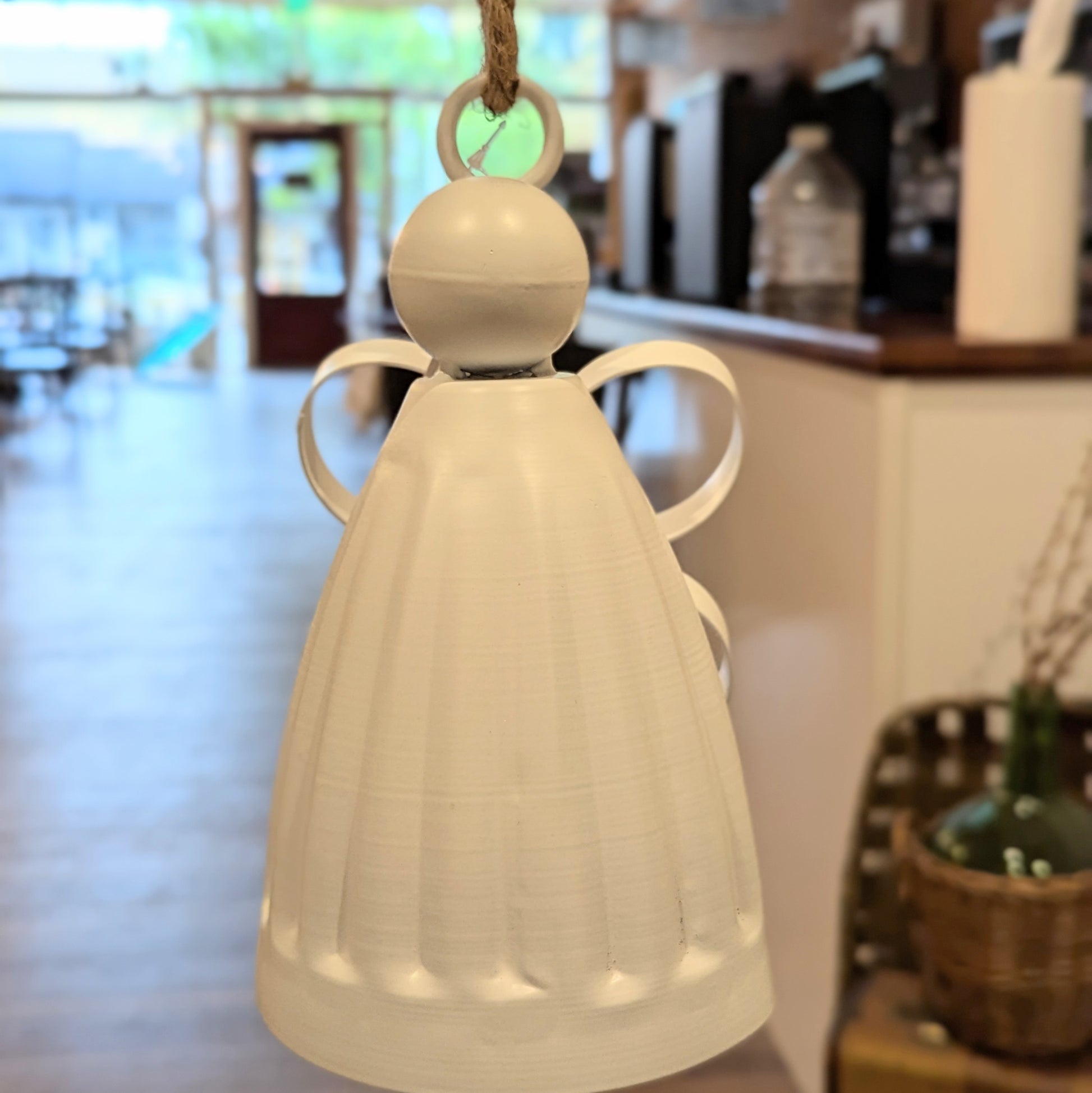 White metal angel bell measure approximately 8" x 5" and hangs from a bit of small jute rope.