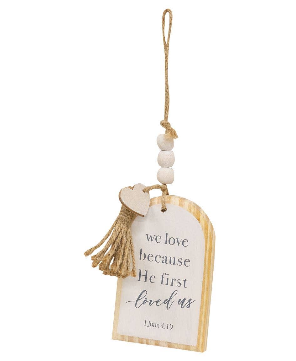 This ornament has an arch shape and hangs by a jute rope, accented by white beads with a cross or heart cut-out. It reads, "we love because He first loved us - 1 John 4: 19" and measures approximately 4" x 2.5" and .5" deep.