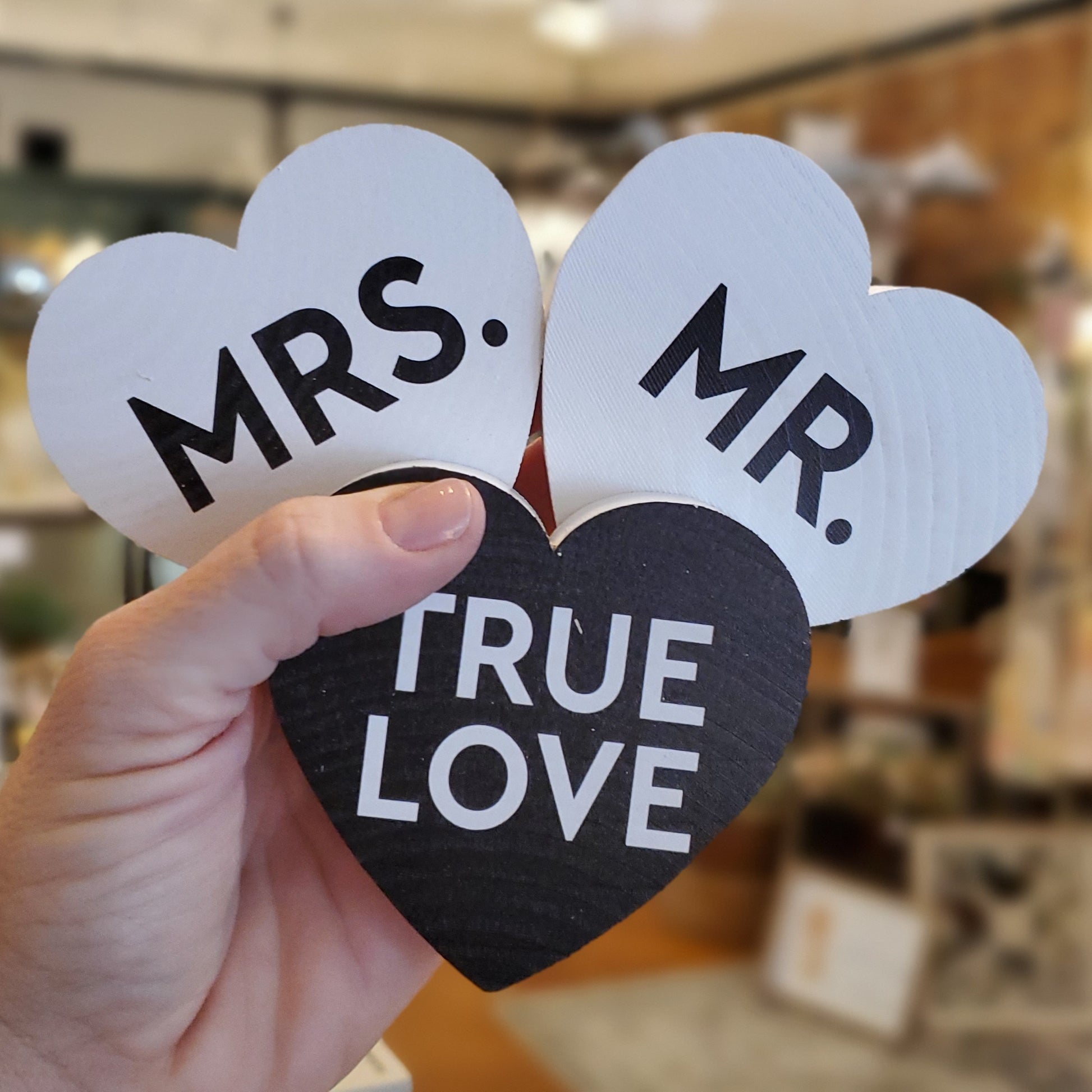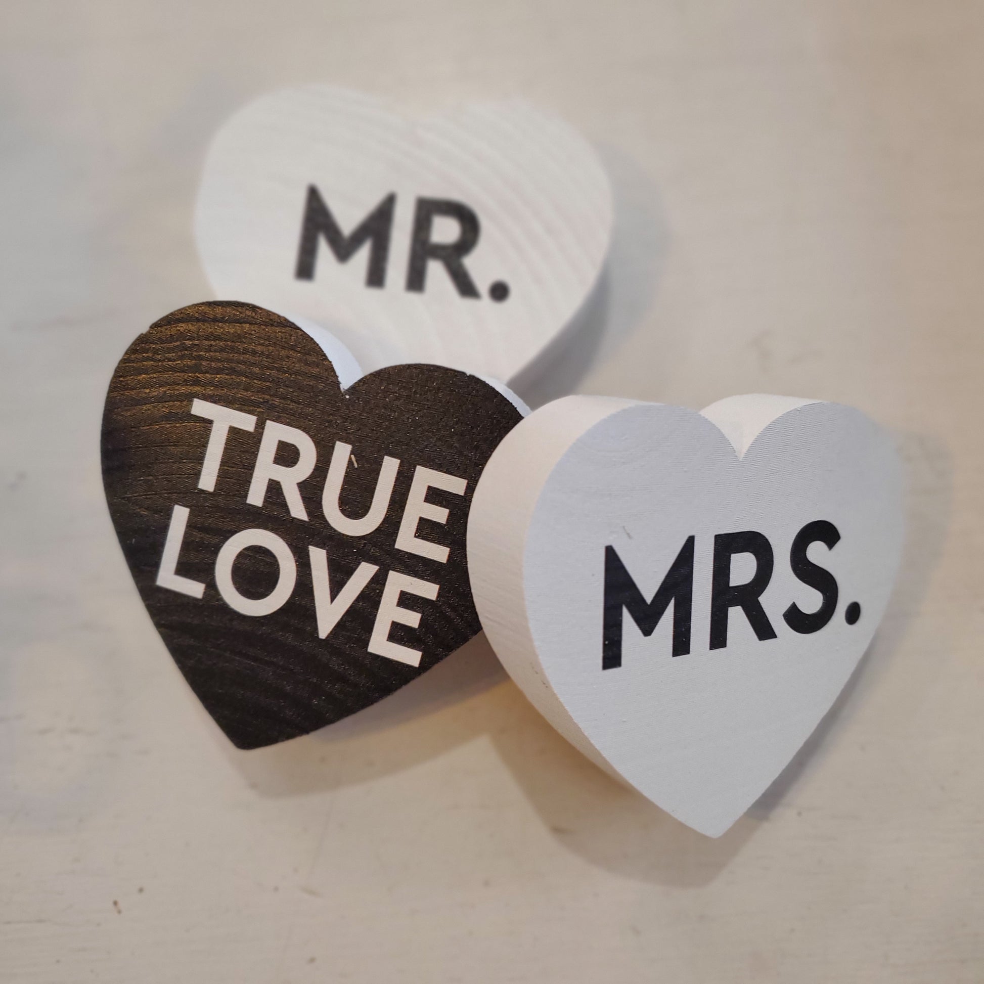 Set of three black and white hearts: Mr, Mrs, and True Love.