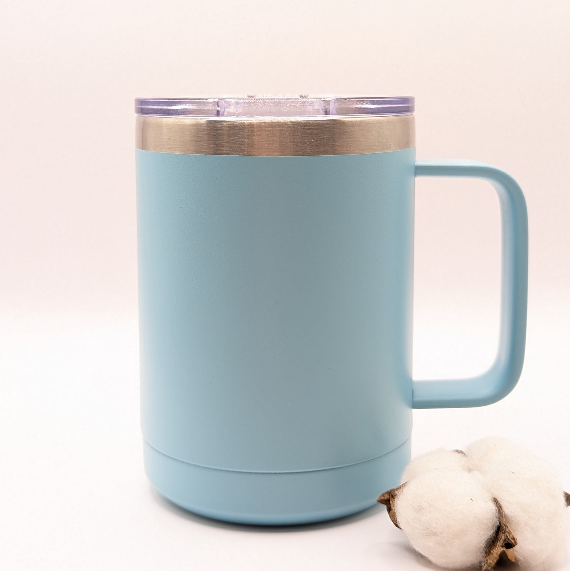 15oz stainless steel cup with handle is suitable for either hot it or cold beverages.