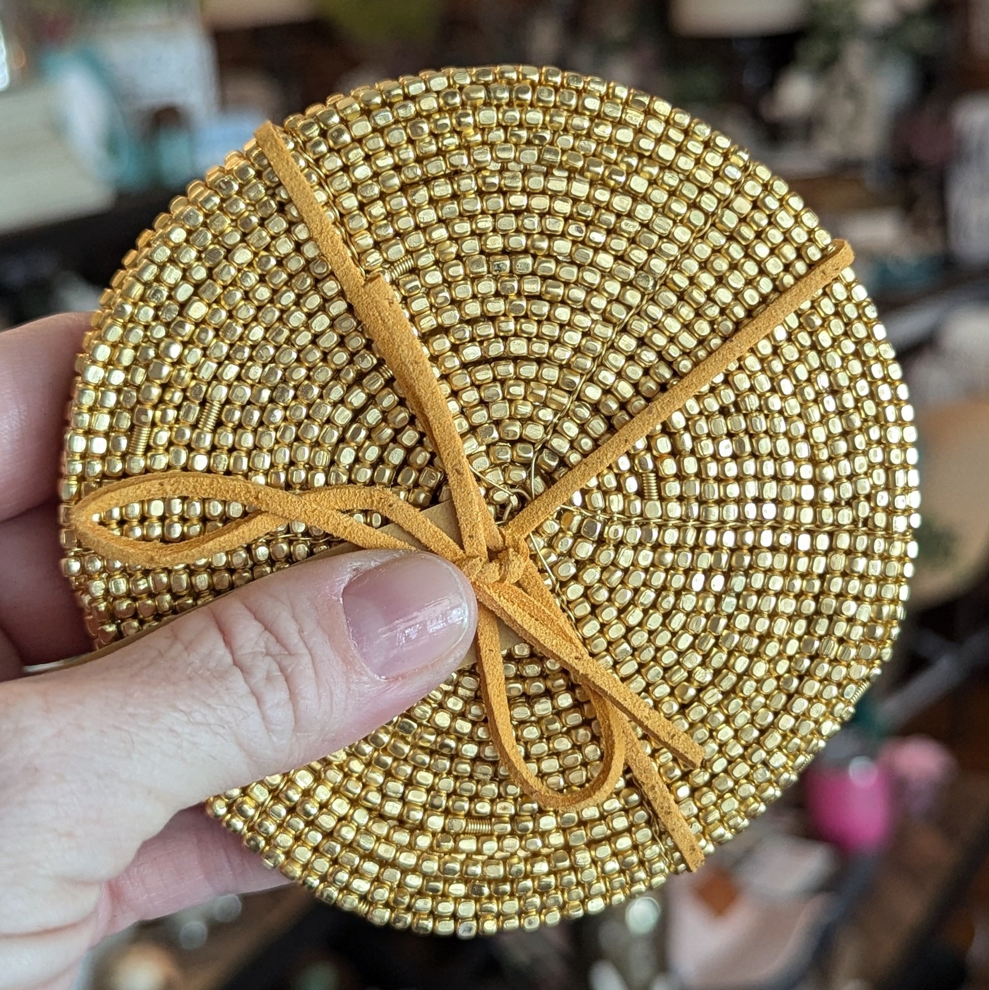 Set of four glamorous coasters measures approximately 4" in diameter.