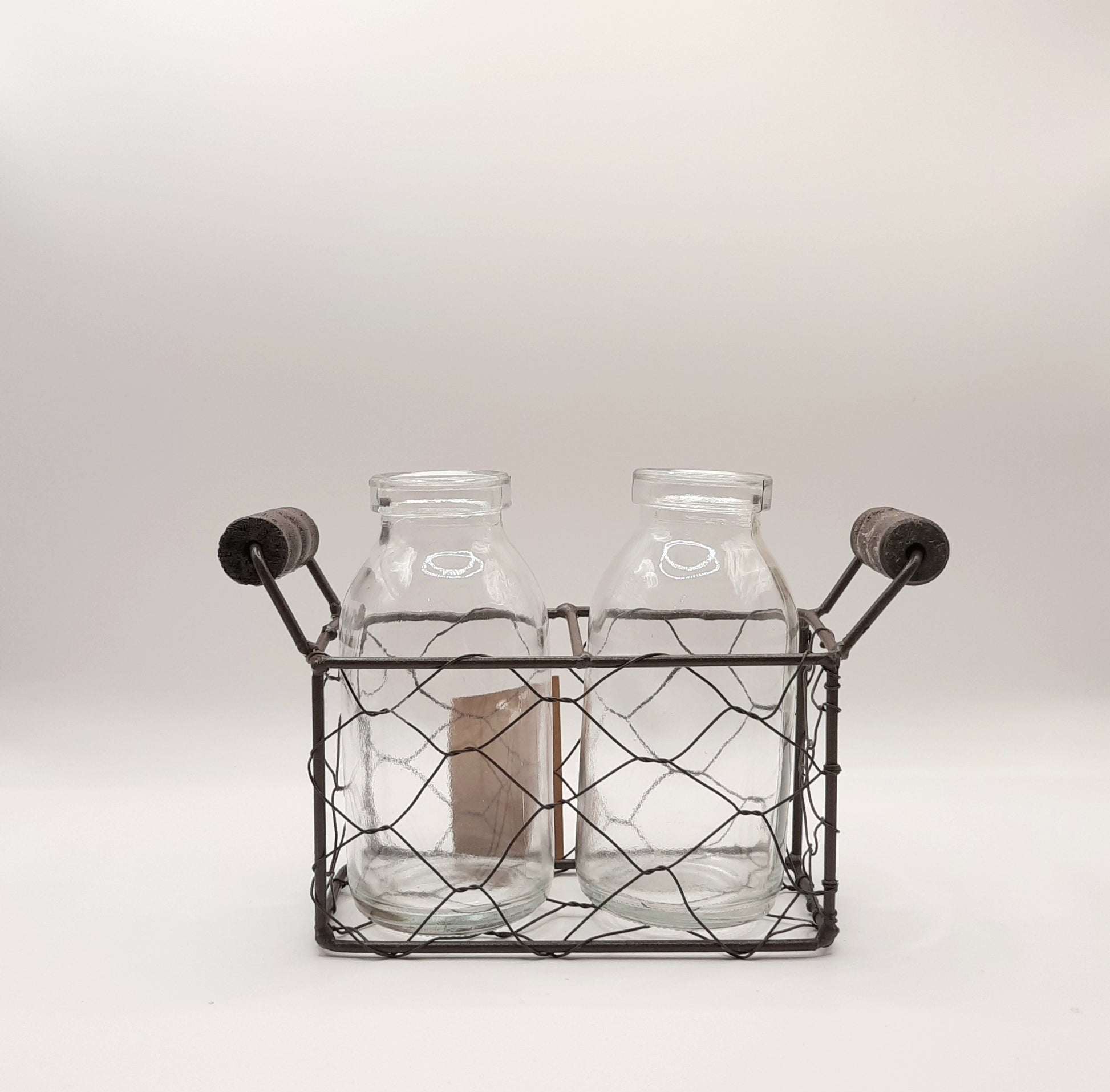 This cute little chicken wire caddy holds two small glass bottles.